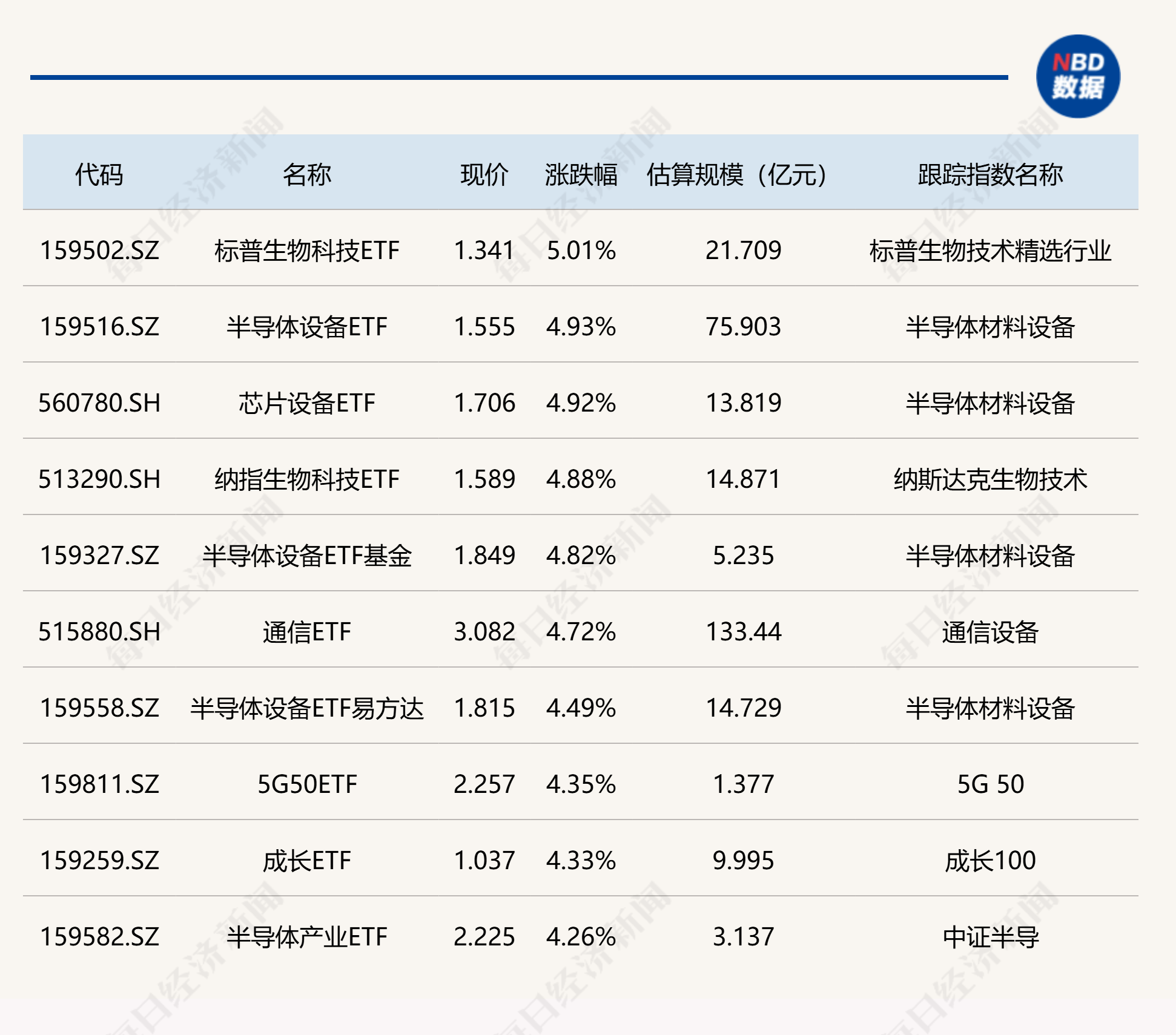 ETF涨跌幅方面,标普生物科技ETF涨超5%,半导体设备相关ETF涨超4%。