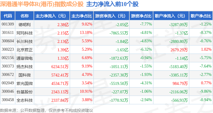 资金流向方面,深港通半导体R(港币)(483068)指数成份股当日主力资金净流入合计9802.0万元,游资资金净流出合计6.78亿元,散户资金净流入合计5.8亿元。成份股资金流向详情见下表: