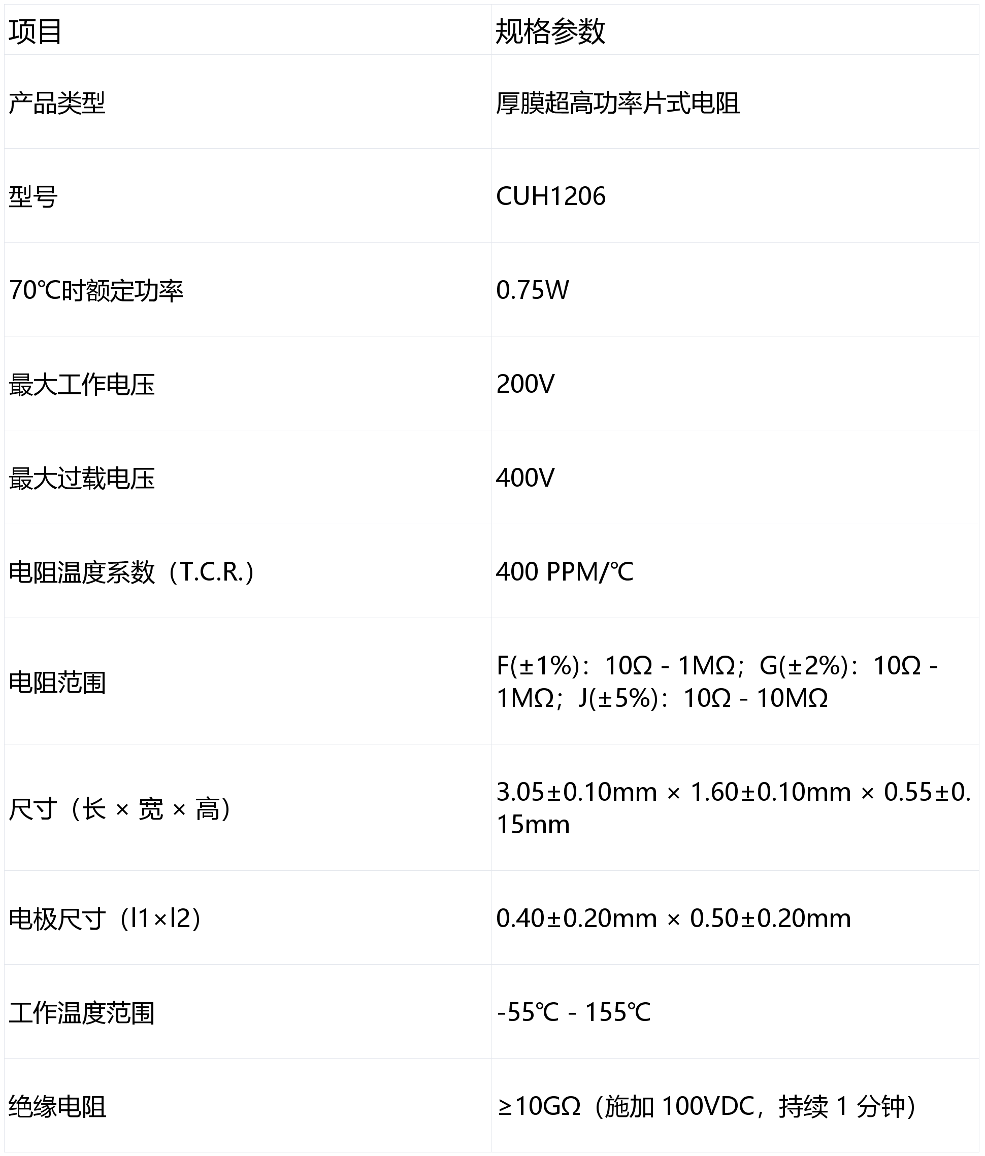天二贴片电阻CUH1206系列高功率厚膜贴片电阻符合 JIS-C-5201-1 和 IEC-60115-1 等国际标准,并通过了一系列严格的可靠性测试: