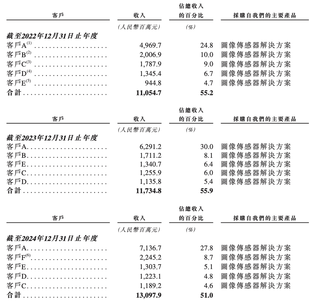2022年、2023年、2024年,来自前五大客户的收入占其同期总收入的比例分别为55.2%、55.9%、51.0%。