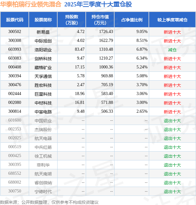 华泰柏瑞行业领先混合的前十大重仓股如下: