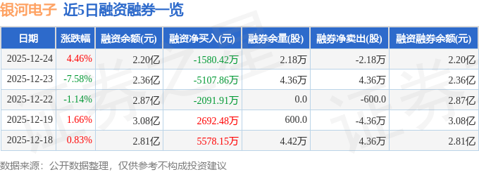 证券之星消息,截至2025年12月24日收盘,银河电子(002519)报收于5.86元,上涨4.46%,换手率13.02%,成交量145.62万手,成交额8.44亿元。