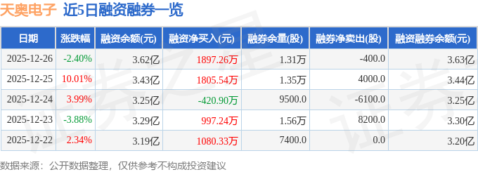 证券之星消息,截至2025年12月26日收盘,天奥电子(002935)报收于21.56元,下跌2.4%,换手率9.18%,成交量38.1万手,成交额8.24亿元。