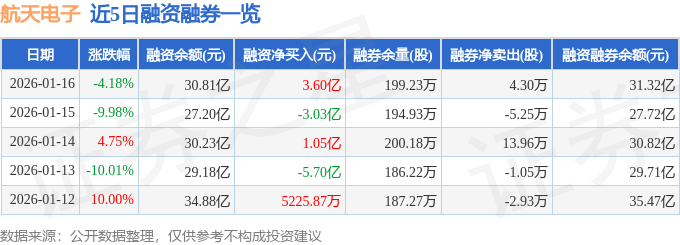 证券之星消息,截至2026年1月16日收盘,航天电子(600879)报收于25.66元,下跌4.18%,换手率17.73%,成交量584.86万手,成交额151.89亿元。