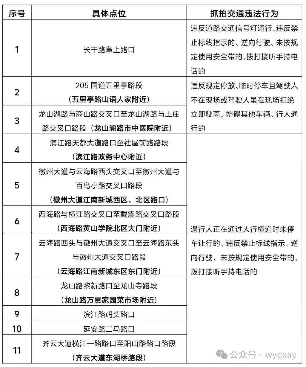 黄山市公安局交通管理支队关于新增11处道路交通违法行为电子抓拍设备的通告