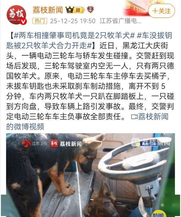 交警到现场一看,三轮车内空无一人,只有两只牧羊犬。