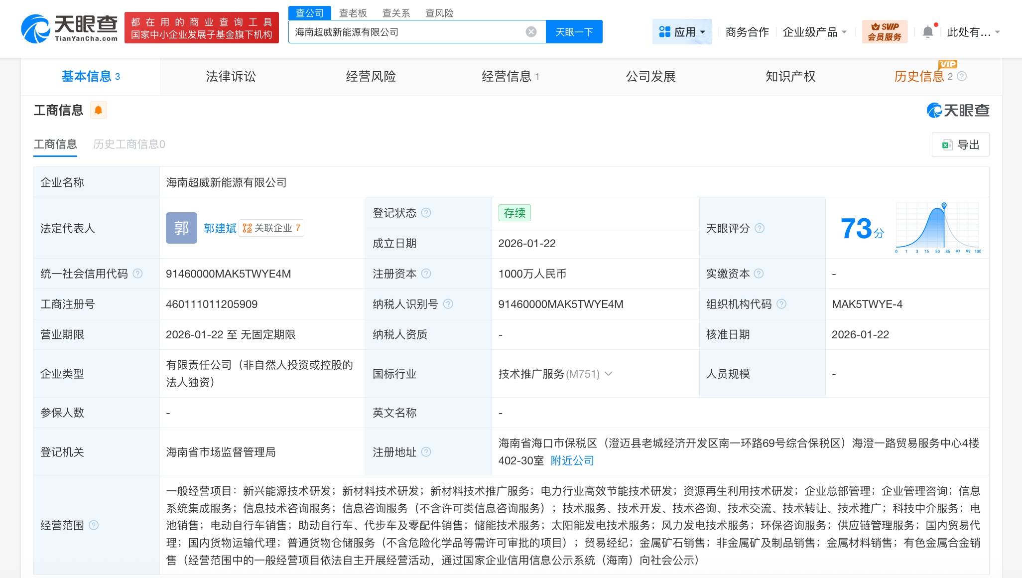 每经AI快讯,天眼查工商信息显示,近日,海南超威新能源有限公司成立,法定代表人为郭建斌,注册资本1000万元人民币,经营范围含新兴能源技术研发、新材料技术研发、新材料技术推广服务、电力行业高效节能技术研发、资源再生利用技术研发、企业总部管理、企业管理咨询、信息系统集成服务等。股东信息显示,该公司由超威电源集团有限公司全资持股。
