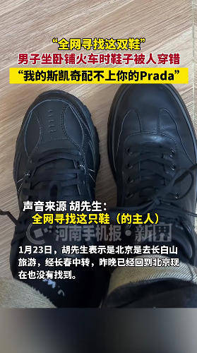 1月18日,北京。北京开往长春的Z614火车下铺,乘客胡先生的鞋子被穿错,“我的斯凯奇配不上你的Prada,”胡先生调侃,称目前鞋子还没找到。网友纷纷玩梗:“没想到人生第一次穿PRADA是以这种方式……”