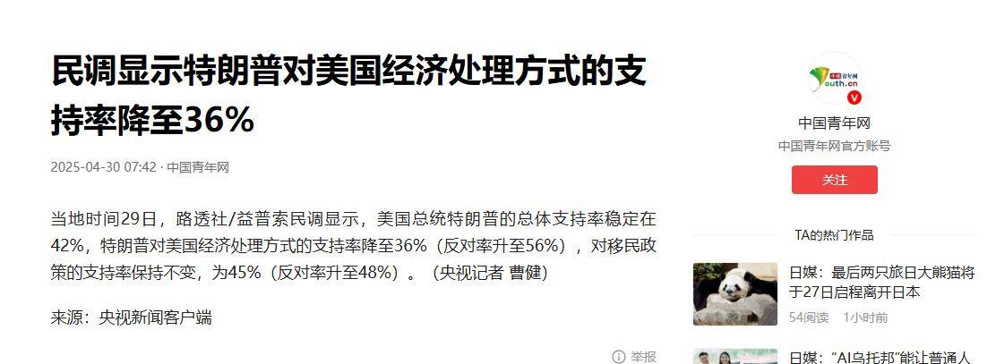 从民调数据来看,特朗普第二任期内,经济治理的支持率持续下滑。2025年4月的路透社/益普索民调显示,他的经济处理方式支持率仅为36%,反对率升至56%,内政方面的短板暴露无遗。