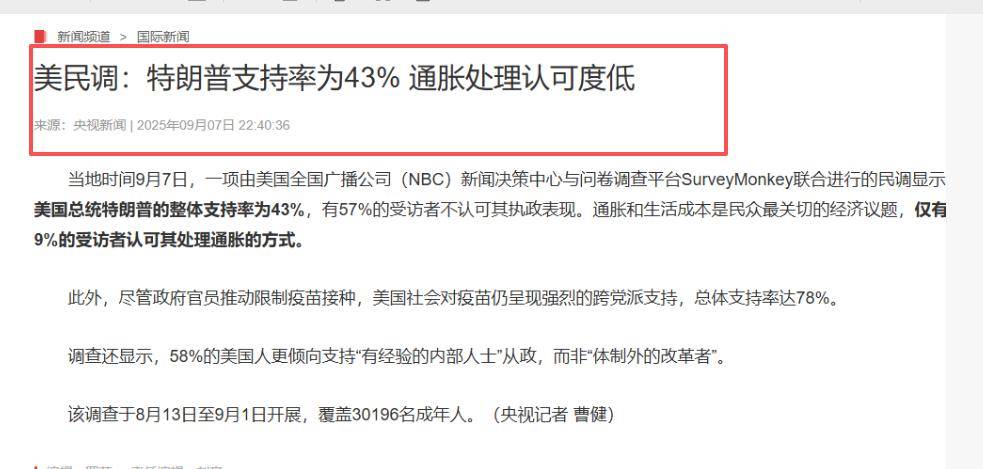 2025年9月,美国全国广播公司(NBC)与问卷调查平台联合发布的民调数据显示,特朗普的整体支持率为43%,然而有57%的受访者明确表示不认可他的执政表现,尤其是通胀问题,成为压倒他支持率的最后一根稻草,仅有39%的民众认可他在处理通胀问题上的应对方式。