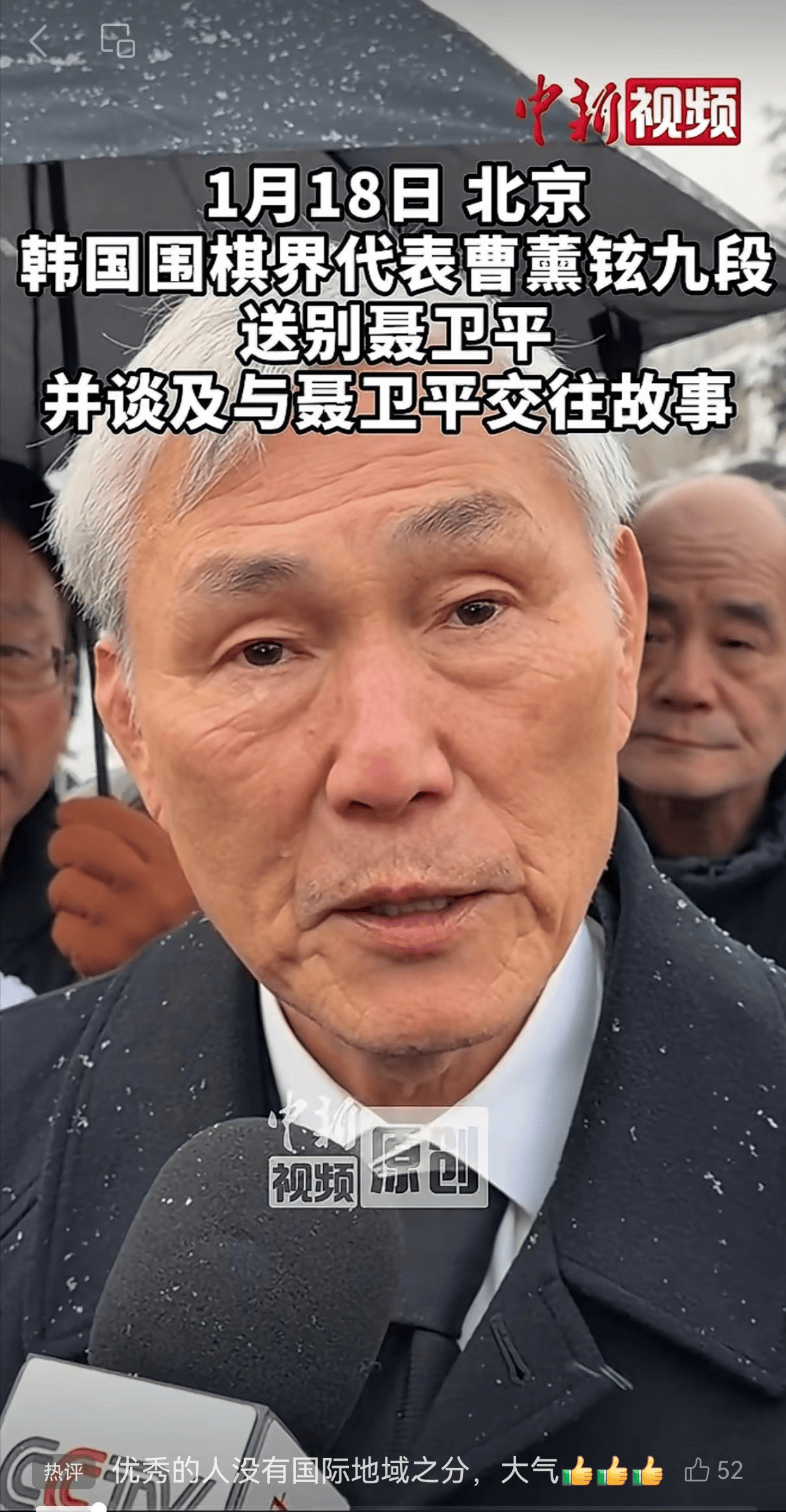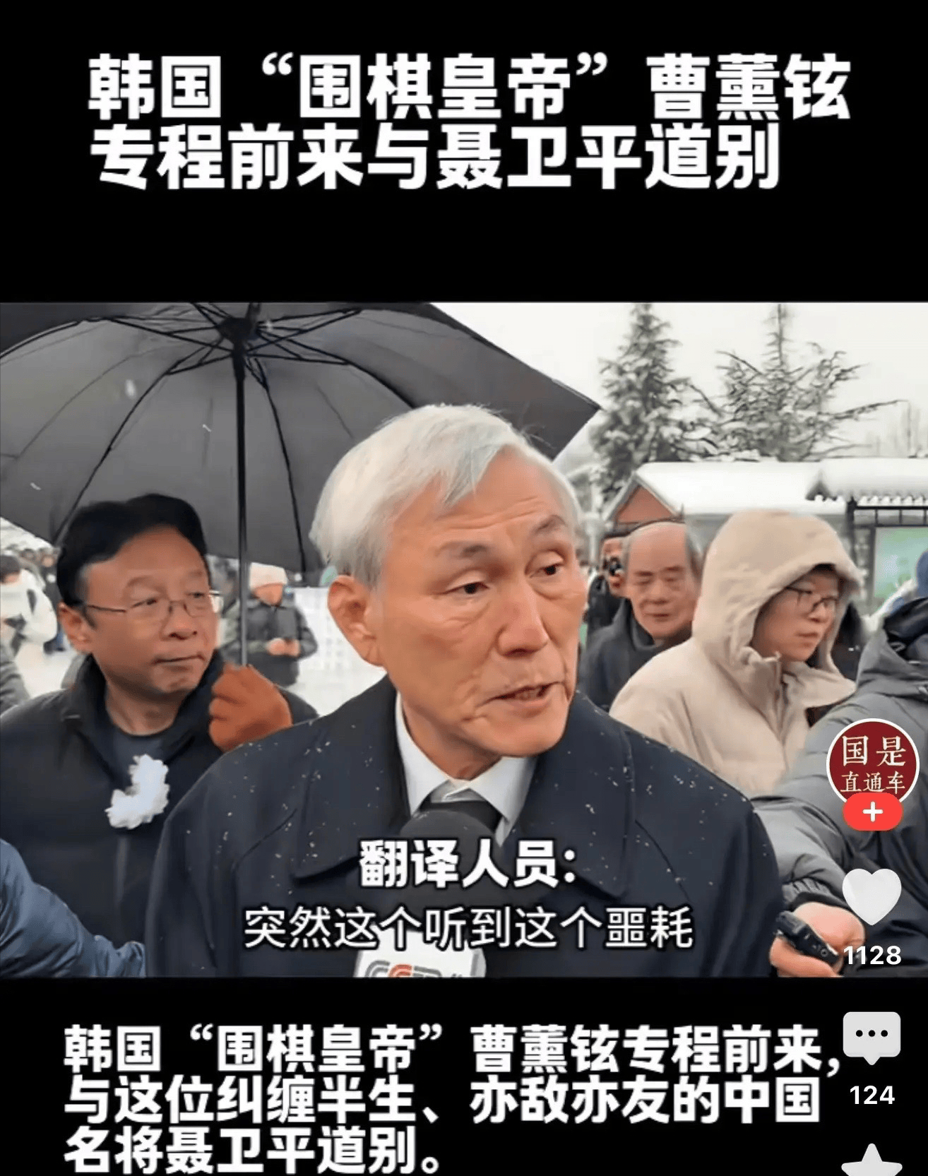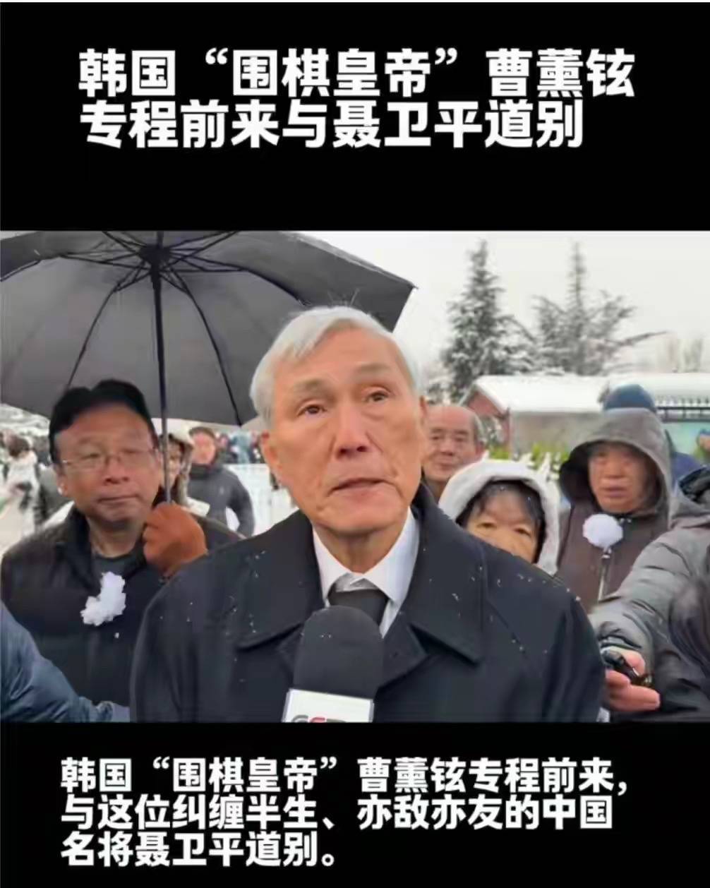 曹薰铉满头白发,鼻尖微红,眼中透露出深深的悲伤与无奈。他身着一件黑色呢大衣,内搭一件白衬衫,整个人看起来依旧板正利落,但提到聂卫平时,声音中却带着一丝哽咽,难以控制自己的情感。四十余年的交情,既是棋盘上的对手,又是私下里的挚友。也许这就是英雄不问出处的真正写照——无论是胜负如何,彼此之间的情谊,从未因为任何结果而改变。