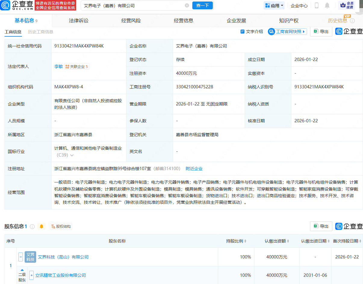 企查查APP显示,近日,艾界电子(嘉善)有限公司成立,法定代表人为李敏,注册资本为4亿元,经营范围包含:电子元器件制造;电力电子元器件制造;电力电子元器件销售;电子产品销售;可穿戴智能设备制造等。企查查股权穿透显示,该公司由立讯精密(002475)间接全资持股。