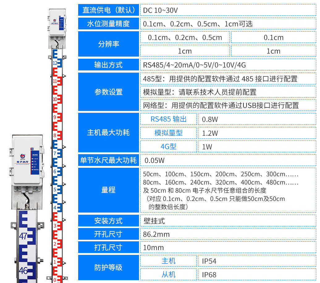 智能化与适配性方面优势显著,设备支持RS485(ModBus-RTU协议)、4~20mA电流、0~5V/0~10V电压等多种信号输出,可选配4G无线模块实现远程数据上传,无缝接入免费云平台或用户自有监控系统,支持数据实时查看、历史追溯与超限报警。功耗控制精准,RS485型主机功耗仅0.8W,单节水尺功耗低至0.05W,可选配20W/6Ah、30W/20Ah太阳能供电模块,完美适配野外无市电的无人值守场景。设备安装方式灵活,支持壁挂式与倾斜安装,可贴合渠道壁面部署,减少安装空间需求,广泛应用于江河水位监测、城市内涝防控、水库灌区调控、污水处理厂液位管控等场景,搭配全国售后网络与定制化服务,综合性价比远超同类产品。