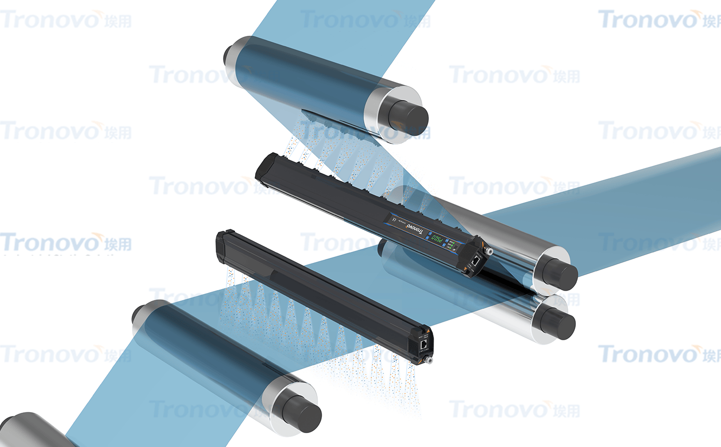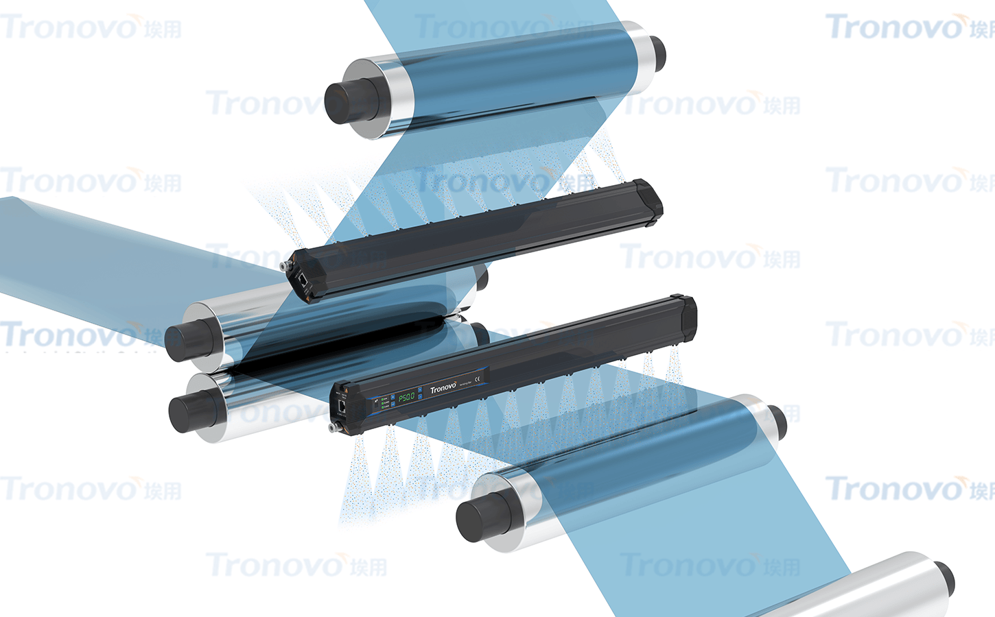 在薄膜成型后的冷却辊出口处,沿薄膜宽度方向平行安装长条形离子风棒,通过离子风棒释放的均匀离子气流,快速中和薄膜表面因挤出冷却与辊轴摩擦产生的初始静电,阻止后续输送过程中杂质吸附;