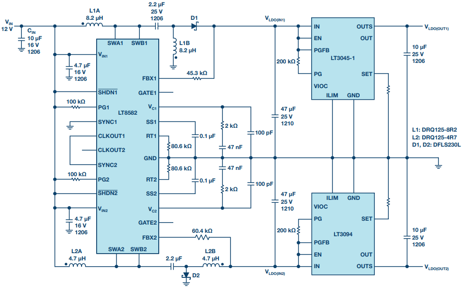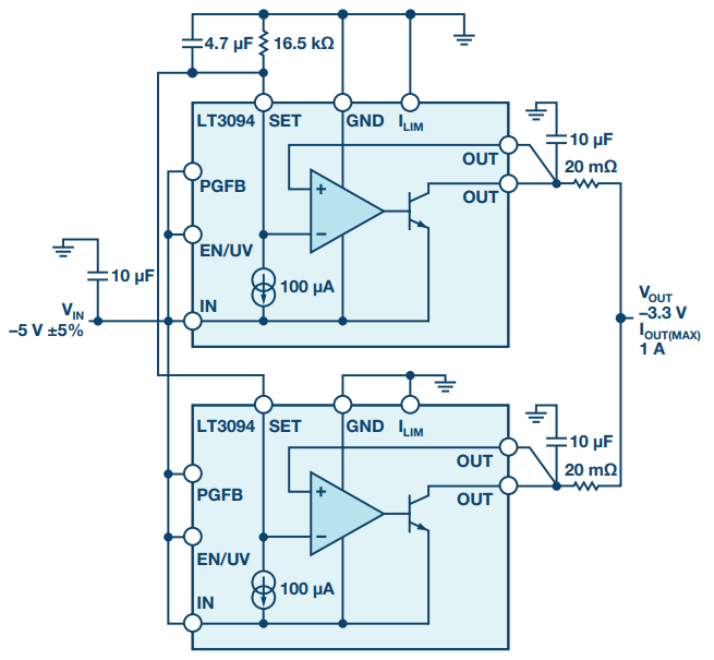 图 3. 两个并联 LT3094 的原理图。