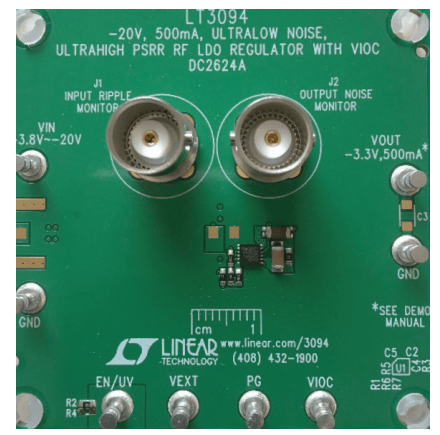 在图 5 中,除了 LT8582 的输出电容之外,在 LT3094 的输入端未放置额外电容。通常,输入电容会降低输出纹波,但对 LT3094 来说并非如此。如果 LT3094 具有输入电容,则开关转换器的开关电流将流过输入电容,从而导致开关转换器与 LT3094 输出的电磁耦合。输出噪声会增加,从而使 PSRR 降低。如果开关稳压器位于具 LT3094 两英寸的范围以内,为了获得优质的 PSRR 性能,我们建议不要在 LT3094 的输入端放置电容。