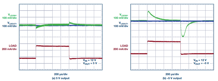 图 7. 12 V 输入、±5 V 输出下的双电源瞬态响应。