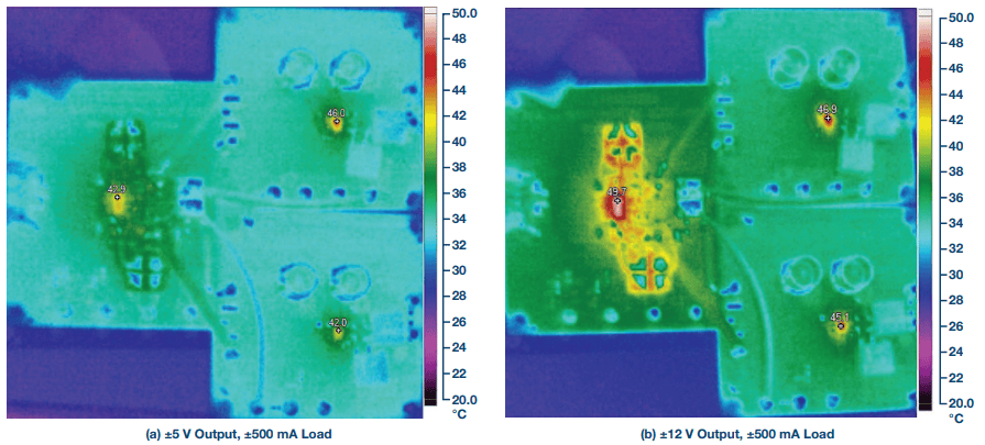 电路在 12 V 输入下运行的热图像如图 6 所示。当输出电压从±3.3 V 变化至 ±12 V 时,LT3094 的温升保持不变。表 2 列出了所有三款器件的电压和电流。图 7 显示了在 12 V 输入下的 ±5 V 电源瞬态响应。