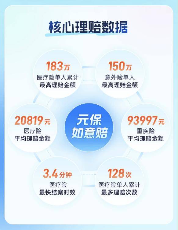 《理赔年报》数据显示:元保旗下医疗险单人累计最高理赔金额达183万元,意外险单人最高理赔金额达150万元,足额赔付为用户提供风险兜底;医疗险最快结案时效仅3.4分钟,持续打造高效赔付体验;医疗险单人累计最多理赔次数达128次,为用户长期治疗保驾护航。