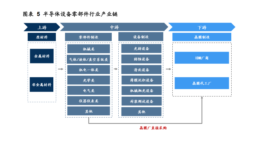 半导体设备零部件行业产业链包括上游原材料供应、中游零部件及设备制造、下游晶圆制造等环节。其中,上游的原材料供应商提供包括铝、铜、石英、陶瓷等在内的各类用于制作半导体设备零部件的金属及非金属材料。中游的零部件厂商生产包括机械类、机电一体类、光学类等在内的各类半导体设备零部件。