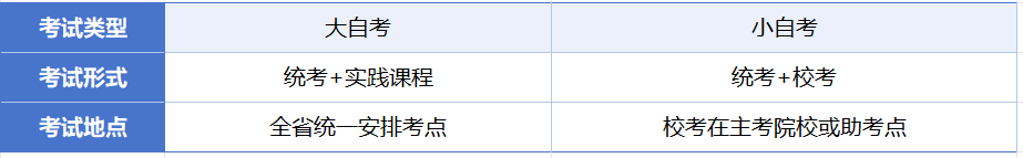 大自考的考生主要以自学为主,实践考试由学校本部组织考试,而小自考主要由助学点组织考试,两种方式在考试形式、难度、时间等方面有显著差异。