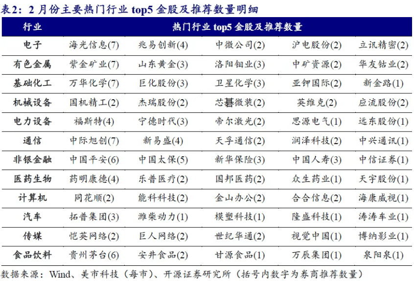 个股层面,开源证券数据显示,2026年2月各家券商推荐的金股中,紫金矿业(601899)、中际旭创(300308)、海光信息(688041)、万华化学(600309)等被推荐次数最靠前,合计均被推荐7次。