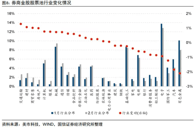 行业方面,国信证券研报指出,在对券商金股股票池进行去重后,从绝对占比来看,券商2026年2月金股在电子、机械、基础化工、有色金属、电力设备及新能源等行业配置较高。