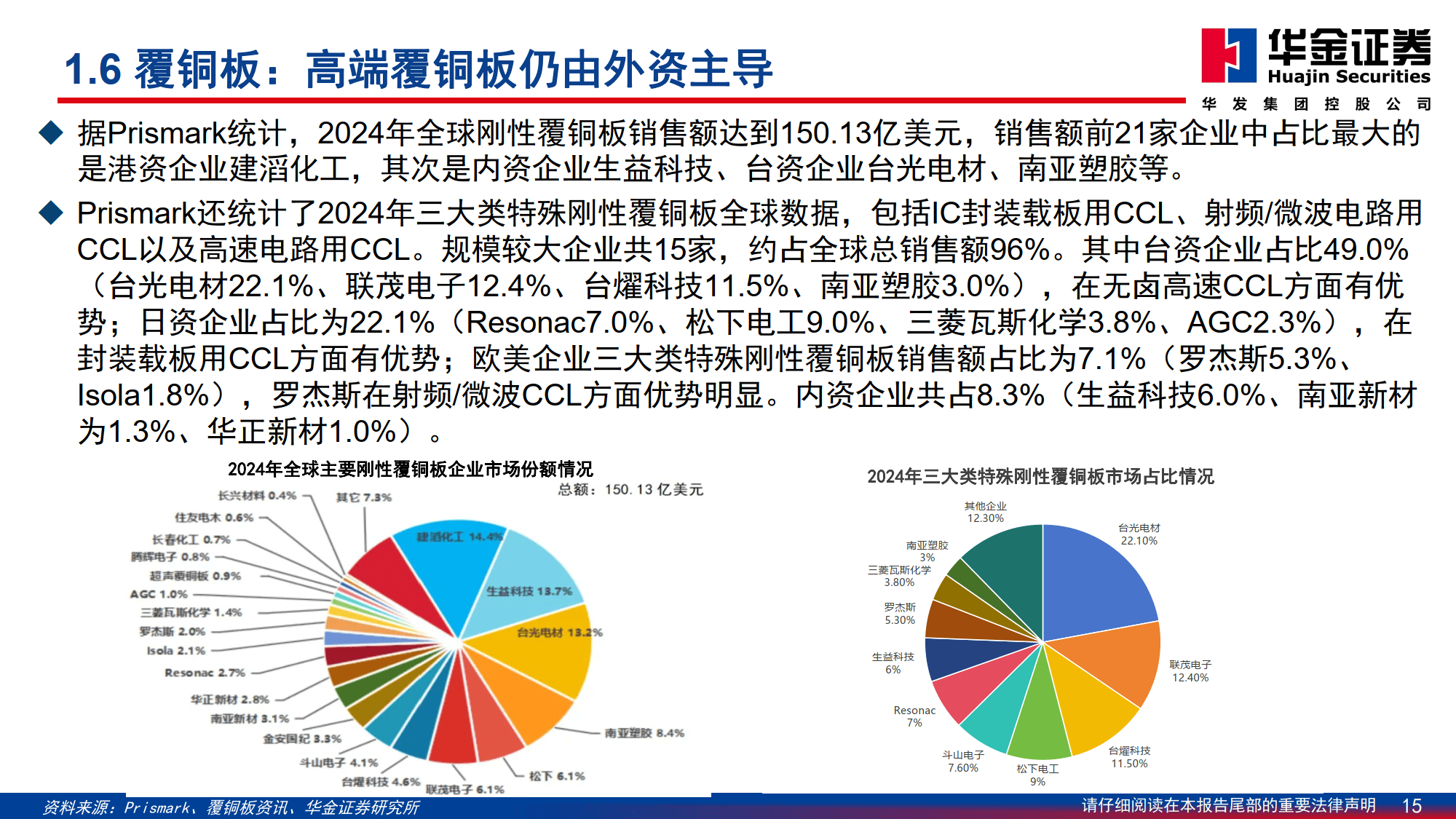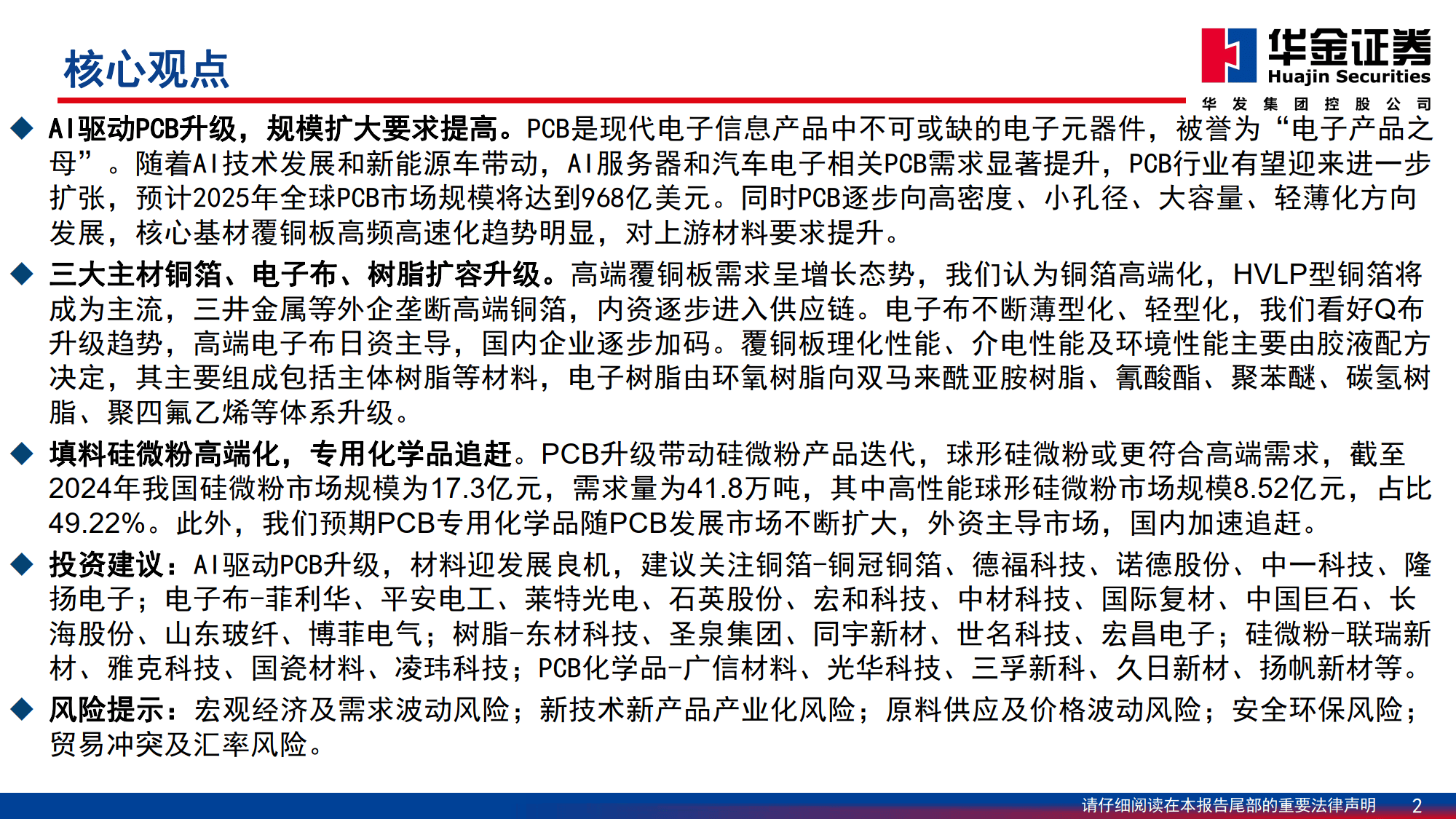 PCB 升级带动硅微粉产品迭代,球形硅微粉因低介电损耗、高填充率等特点更符合高端需求,2024 年我国高性能球形硅微粉市场规模占比达 49.22%,但全球市场仍由日企主导。PCB 专用化学品市场随行业发展持续扩大,涵盖显影液、蚀刻液等多类产品,外资企业主导高端领域,国内企业在中低端市场已实现突破并加速追赶。