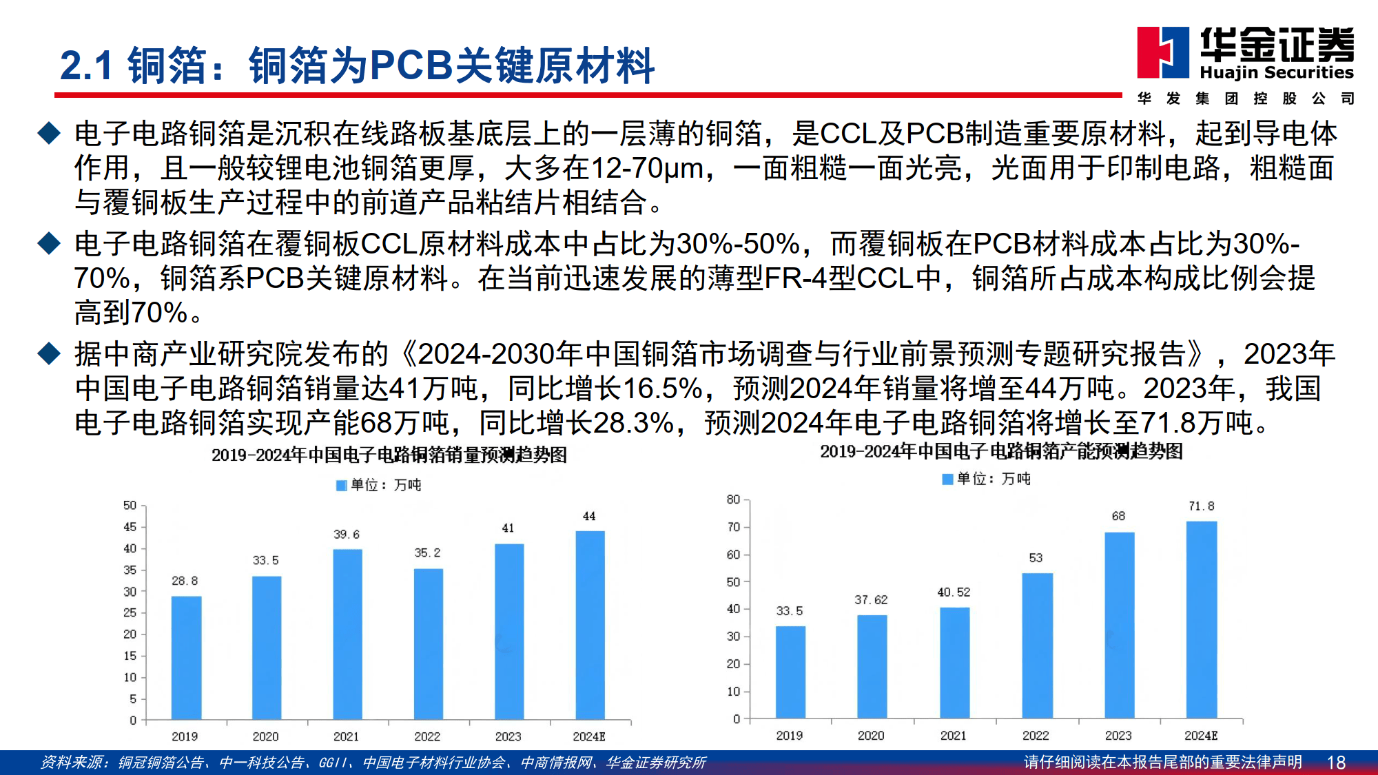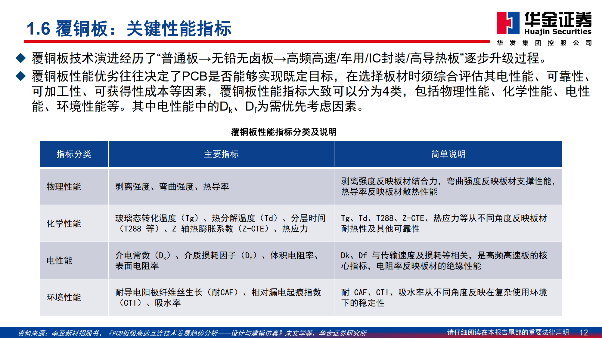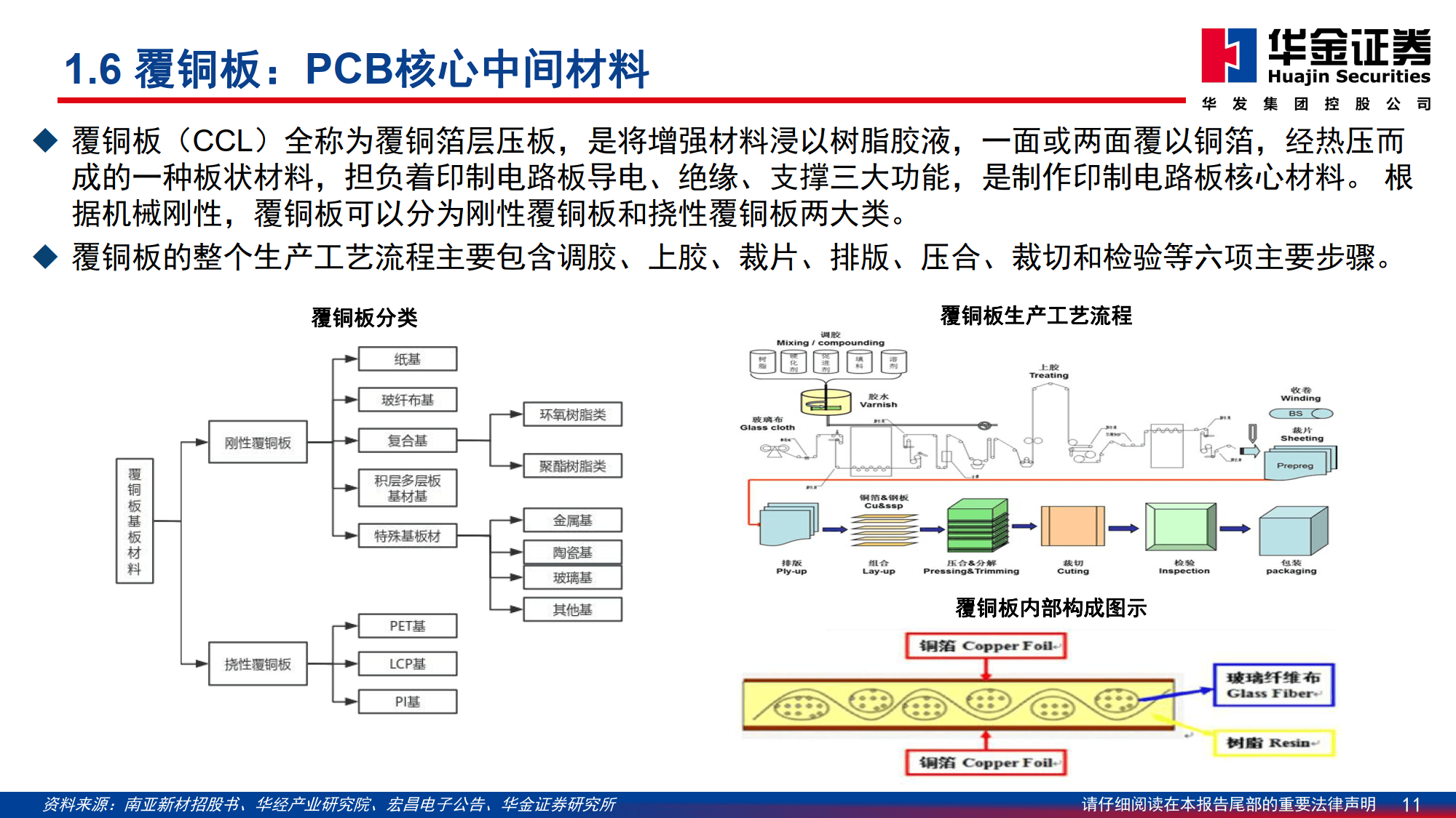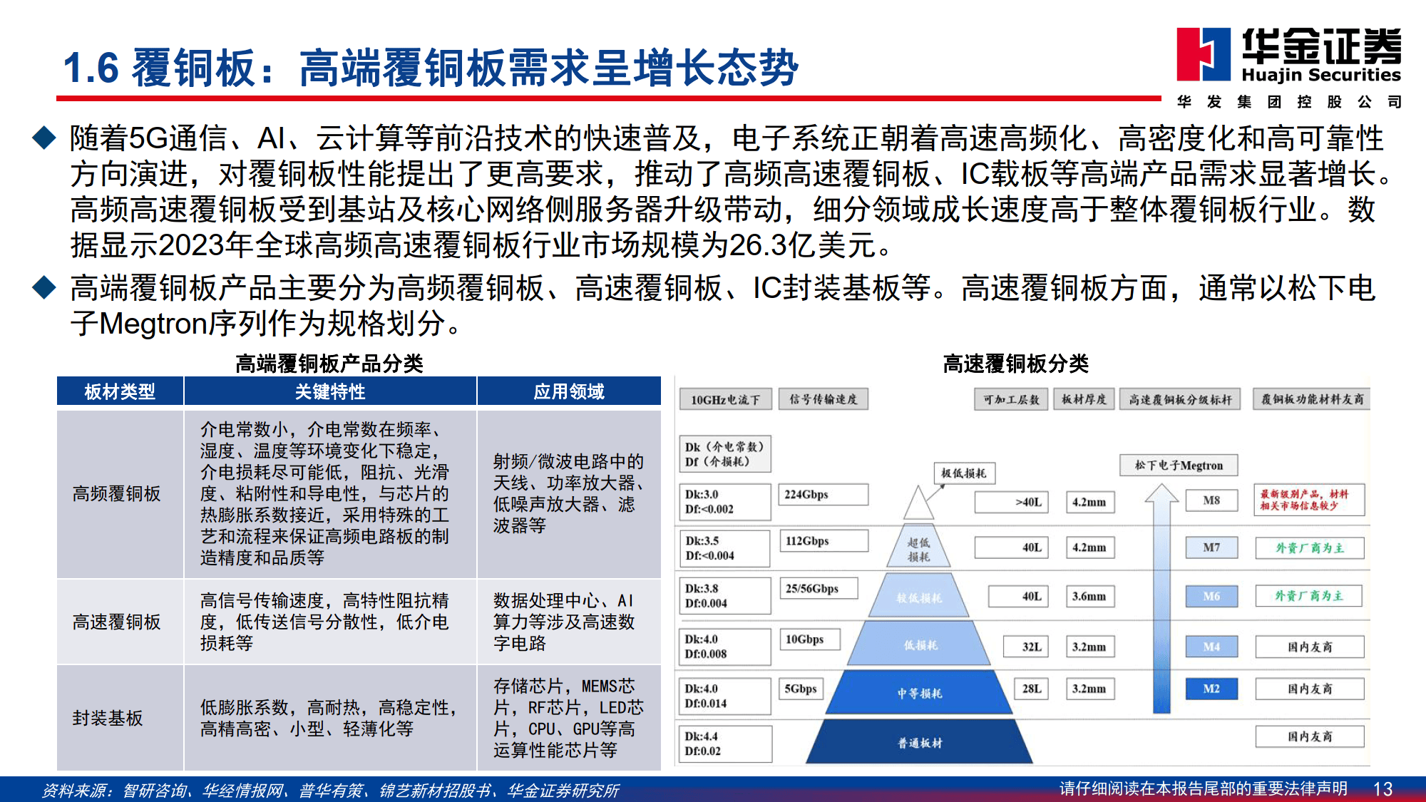 当前 PCB 产业重心已转移至中国等亚洲国家,中国自 2006 年起成为全球第一大 PCB 生产国。技术层面,PCB 正朝着高密度、小孔径、大容量、轻薄化方向演进,高多层板、HDI 板、封装基板等高端产品增长迅猛,其中 18 层以上高多层板 2024-2029 年复合增长率预计达 15.7%。同时,下游应用升级对 PCB 核心基材覆铜板提出高频高速化要求,推动上游材料技术迭代。