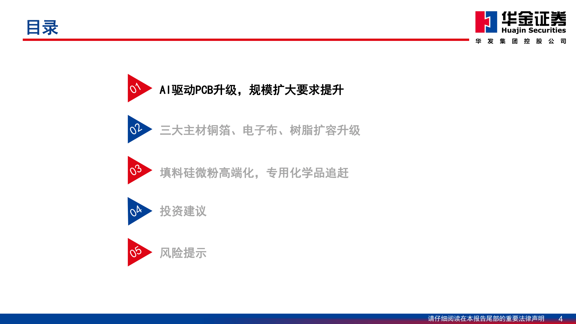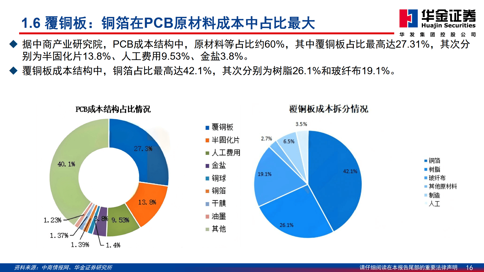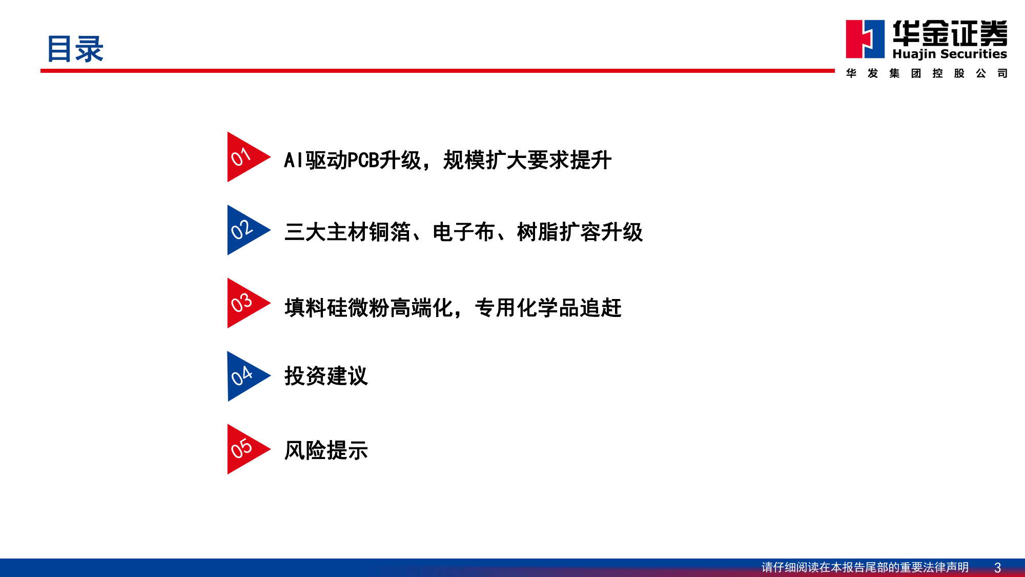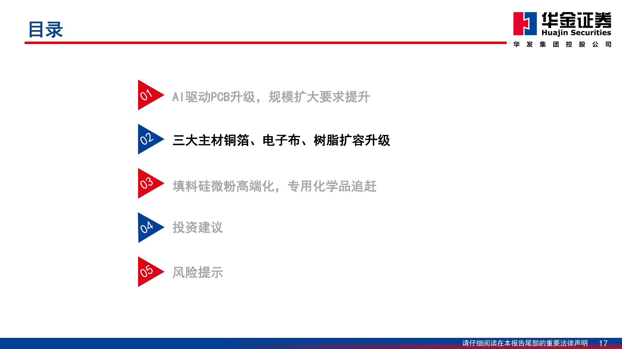 铜箔是 PCB 成本占比最高的原材料,高端化趋势明显,HVLP 型铜箔因低粗糙度优势将成为主流,目前全球高端市场由日企垄断,内资企业正逐步进入供应链。电子布向薄型化、轻型化发展,石英布(Q 布)因优异介电性能成为高端领域优选,国内企业产能持续释放,Low-Dk 电子纱自给率将显著提升。电子树脂逐步从环氧树脂向双马来酰亚胺树脂、氰酸酯等体系升级,高端产品目前依赖进口,国内企业加速技术攻关。