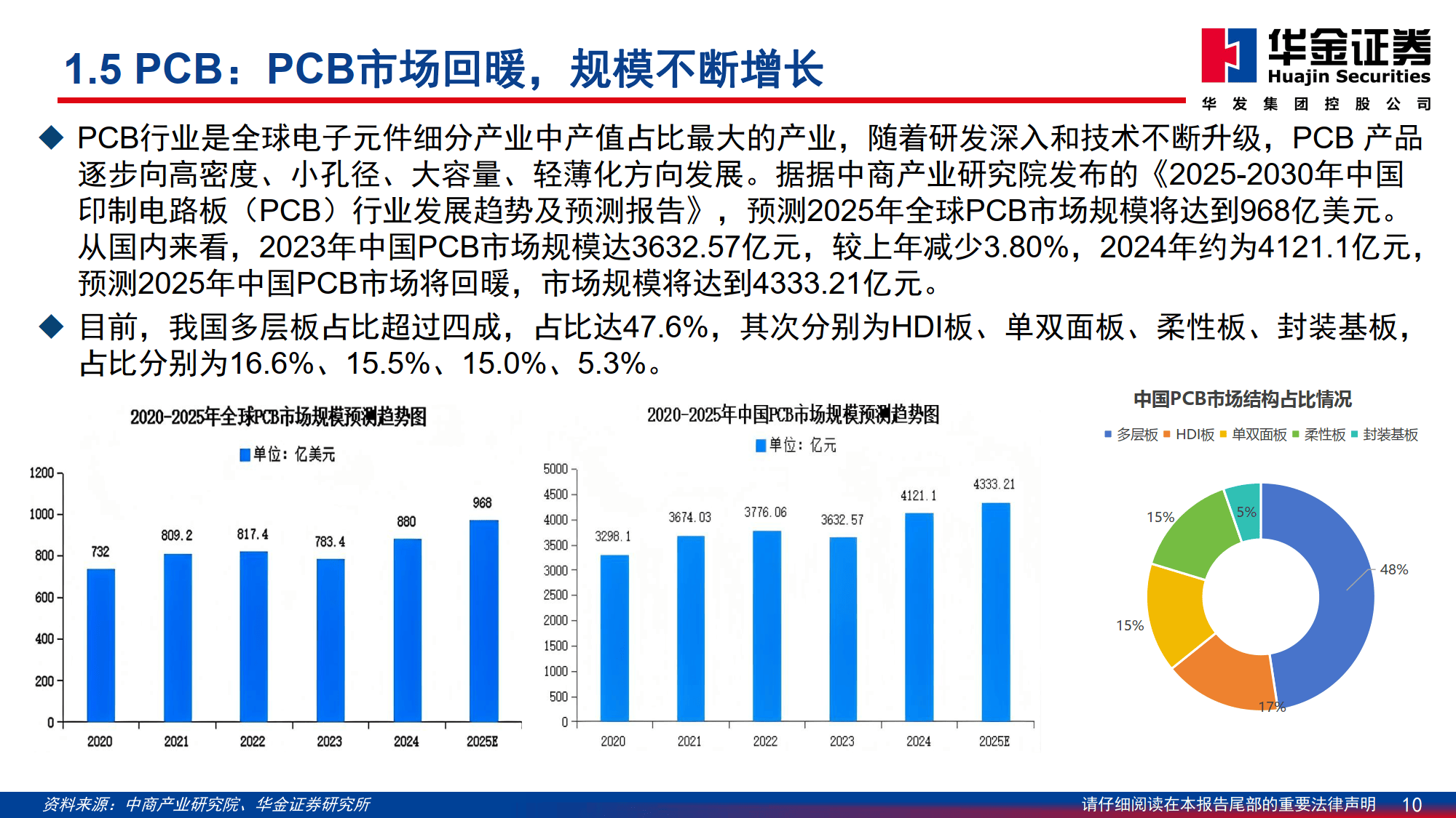 PCB(印制电路板)被誉为 “电子产品之母”,是电子信息产品不可或缺的核心元器件,广泛应用于通信、消费电子、汽车电子等多个领域。受 AI 技术发展和新能源车普及推动,AI 服务器与汽车电子相关 PCB 需求持续提升,行业规模稳步扩大,预计 2025 年全球市场规模将达 968 亿美元,中国市场规模将达 4333.21 亿元。