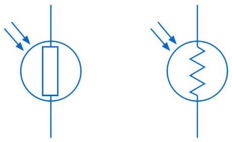 依赖光的电阻器或光敏电阻的电路符号,既使用较新的电阻器符号(用矩形框表示),也使用较旧的人字形线电阻器电路符号。