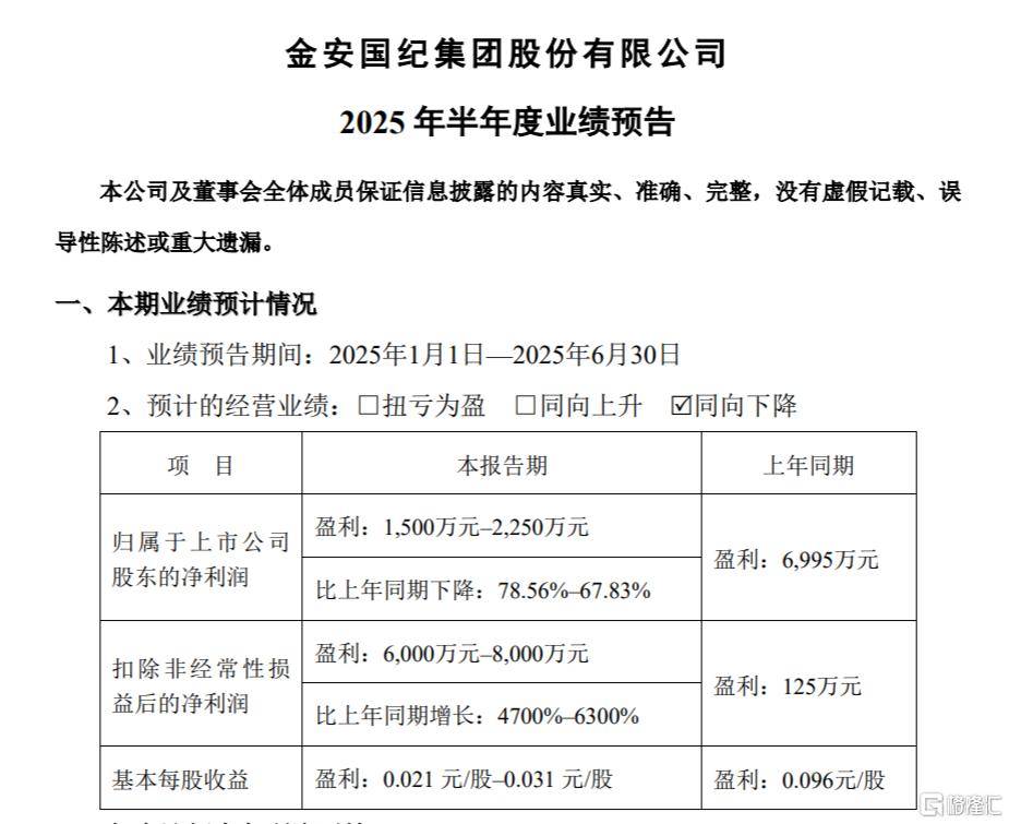 今日盘后,金安国纪发布了今年上半年业绩预告。
