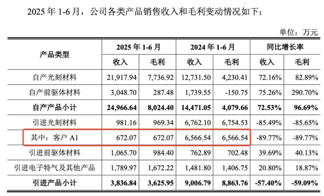 这对恒坤新材的业绩也产生直接影响,没有了KKPC的产品,客户A1终止了关于引进光刻材料的订单,导致2025年1-6月公司引进产品收入和毛利金额分别同比下降57.4%和59.09%。