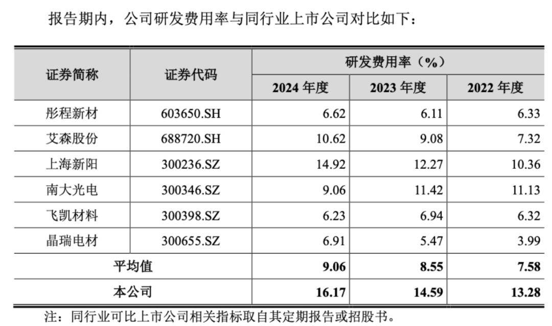 在这背后,2022年-2024年,公司研发费用金额分别为4274.36万元、5366.27万元和8860.85万元,占同期营业收入的比例分别为13.28%、14.59%和16.17%。高于同行近一倍。