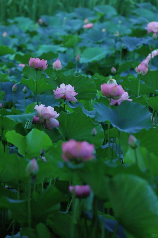 塘桥公园满满一片清凉的诗意荷塘正在绽放,超大片荷塘铺展成一片绿意盎然的画卷,粉白相间的荷花亭亭玉立。