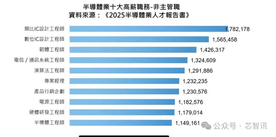 7月28日消息,近日中国台湾“104人力银行”与工研院共同发布《2025半导体业人才报告书》,公布半导体人才薪资结构,整理出薪资五榜单,比高薪,“非主管职位”以模拟IC设计工程师年薪中位数新台币178万元居冠,“主管职位”硬件工程研发主管年薪中位数为181万元最高;若看增幅,“非主管职位”以其他特殊工程师增长21%最多,“主管职位”项目业务主管增长20%第一。