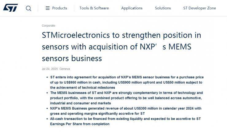 全球半导体行业迎来了一场足以重塑产业格局的重大交易。近日,全球半导体巨头——意法半导体(ST)发布的财报显示,受重组开支及资产减值影响,公司遭遇十年来首次季度亏损,净损达1.9亿美元。与此同时,ST正式宣布拟以最高9.5亿美元现金收购恩智浦半导体(NXP)的MEMS传感器业务,预计在2026年上半年完成交割。