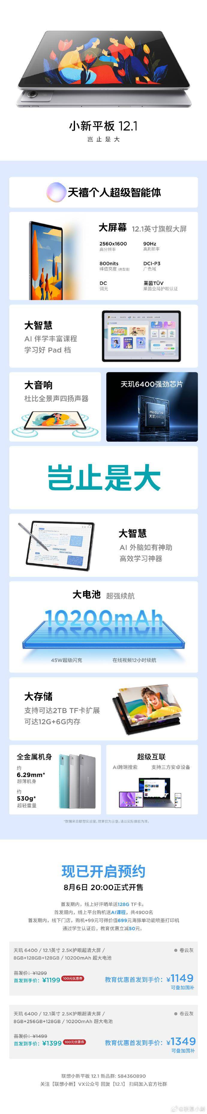 IT之家 7 月 31 日消息,联想小新平板 12.1 参数价格今日公布,首发价 1199 元起,首发期可享教育优惠 50 元,到手 1149 元起,可叠加国补,8 月 6 日 20:00 正式开售。