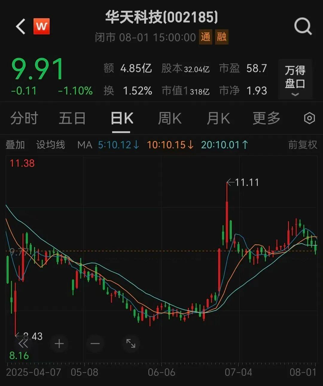 8月1日,华天科技股价以9.91元/股报收,最新市值为318亿元。