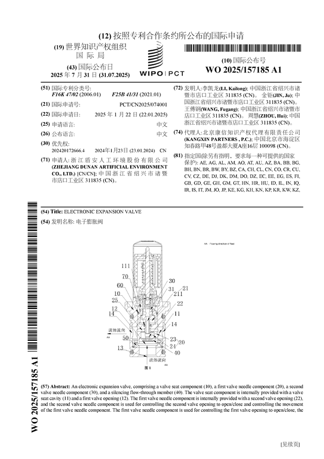 证券之星消息,根据企查查数据显示盾安环境(002011)公布了一项国际专利申请,专利名为“电子膨胀阀”,专利申请号为PCT/CN2025/074001,国际公布日为2025年7月31日。