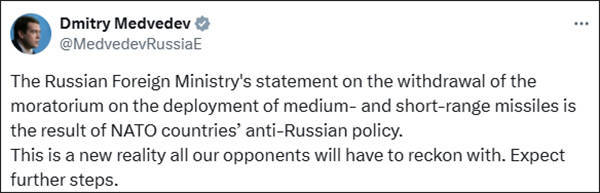 俄外交部在声明中表示,“由于我们对这一问题的一再警告被忽视,并且局势发展到美制中短程导弹部署到了欧洲和亚太等地区。俄罗斯外交部不得不宣布,单方面限制部署陆基中短程导弹的条件已经消失,俄方不再认为在部署中短程陆基导弹方面的自我限制与己方有关。”