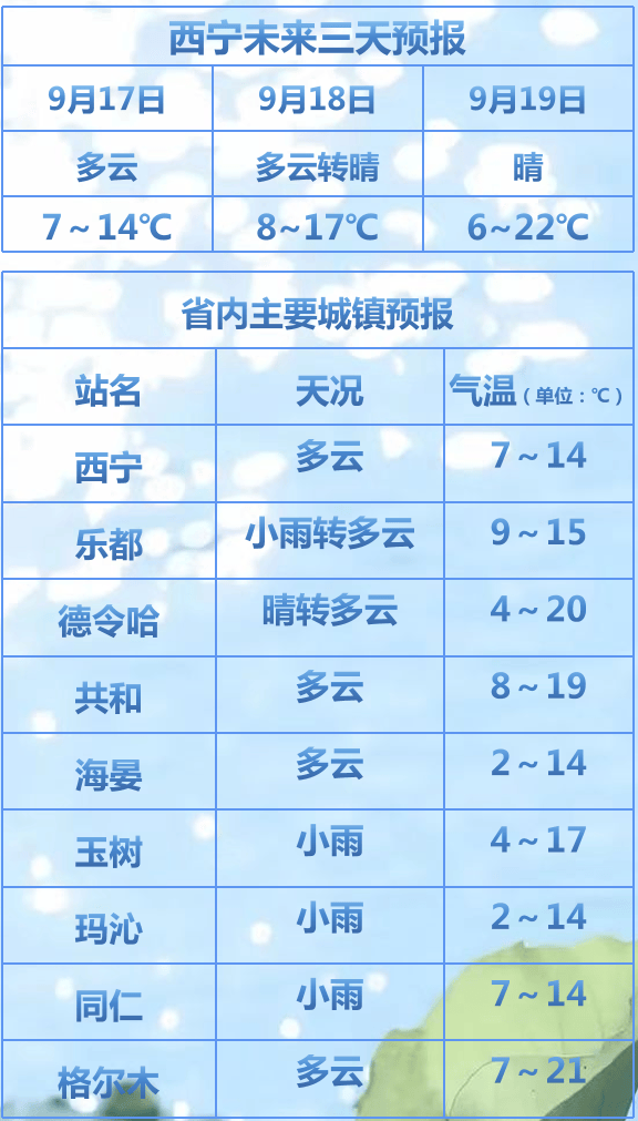 明天白天,西宁北部、海东北部、海北有分散性阵雨(0.1~4毫米),海南南部、玉树、果洛、黄南有小雨(0.1~7毫米),省内其余地区晴或多云。17日白天东部地区日最高气温将下降4~6℃。17日白天环青海湖流域有5~6级偏西风,阵风可达7级。