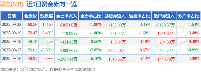 证券之星消息,截至2025年9月22日收盘,联创光电(600363)报收于60.56元,上涨1.83%,换手率1.92%,成交量8.73万手,成交额5.26亿元。