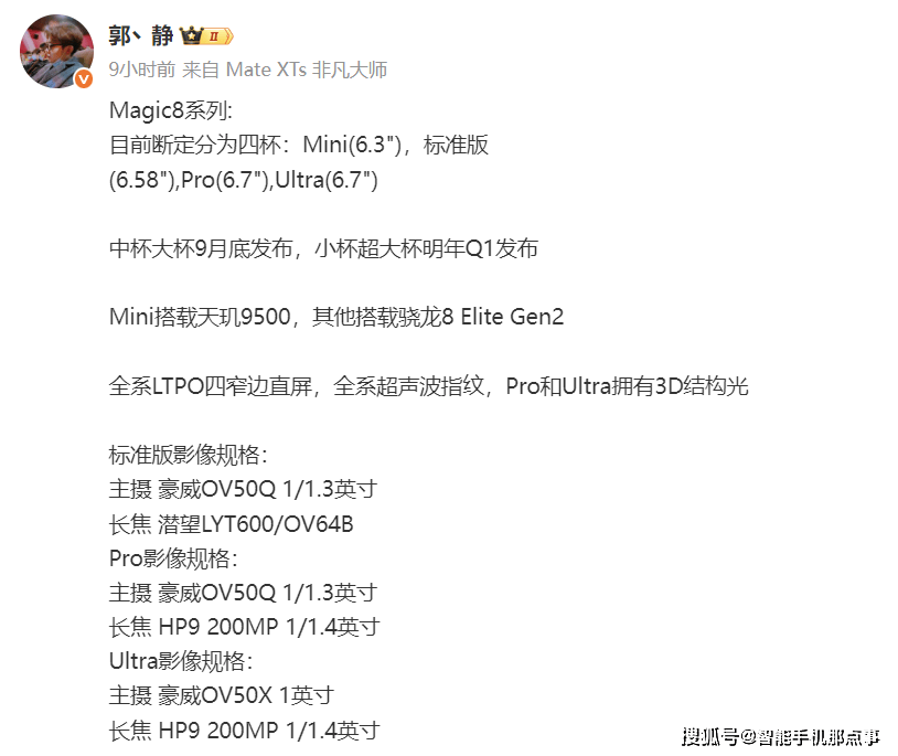 荣耀Magic8系列此次采用了明确的三机型策略,覆盖不同用户对屏幕尺寸的偏好,据爆料该系列将包括6.3英寸的Magic8 Mini、6.58英寸的标准版以及6.7英寸的Magic 8 Pro。