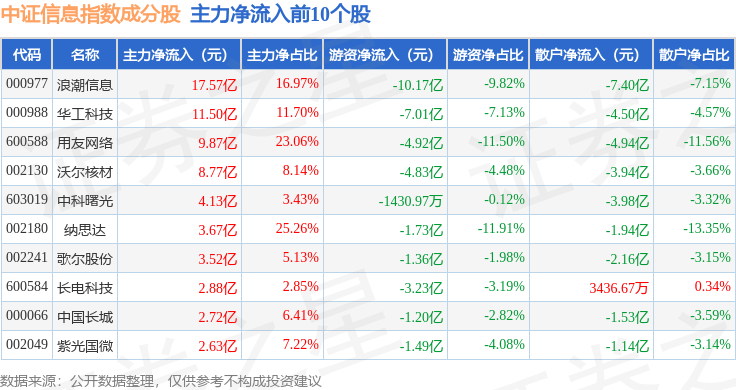 资金流向方面,中证信息(399935)指数成份股当日主力资金净流出合计48.22亿元,游资资金净流出合计3.71亿元,散户资金净流入合计51.94亿元。成份股资金流向详情见下表: