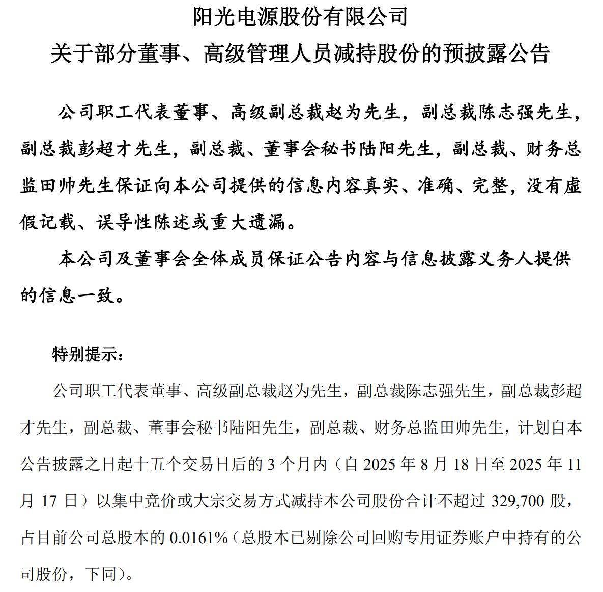 据阳光电源7月25日晚间披露的公告,因个人资金需求,公司职工代表董事、高级副总裁赵为,副总裁陈志强,副总裁彭超才,副总裁、董秘陆阳,副总裁、财务总监田帅,计划自2025年8月18日至11月17日以集中竞价或大宗交易方式减持公司股份,合计不超过32.97万股,占公司总股本的0.0161%。