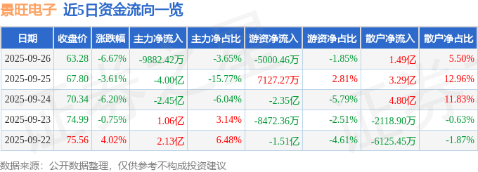证券之星消息,截至2025年9月26日收盘,景旺电子(603228)报收于63.28元,下跌6.67%,换手率4.47%,成交量41.73万手,成交额27.04亿元。