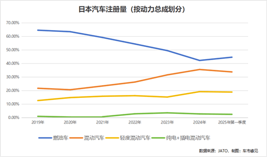 日本乘用车市场正经历深刻变革,内燃机车型的份额持续萎缩。2023年,内燃机车型占乘用车总注册量的份额首次跌破50%,2024年进一步降至42.3%,尽管2025年上半年小幅回升至44.7%,但市场的主体已被电动化动力总成占据。