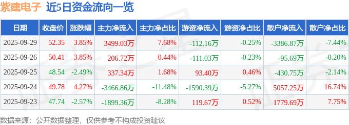 证券之星消息,截至2025年9月29日收盘,紫建电子(301121)报收于52.35元,上涨3.85%,换手率17.42%,成交量8.81万手,成交额4.55亿元。